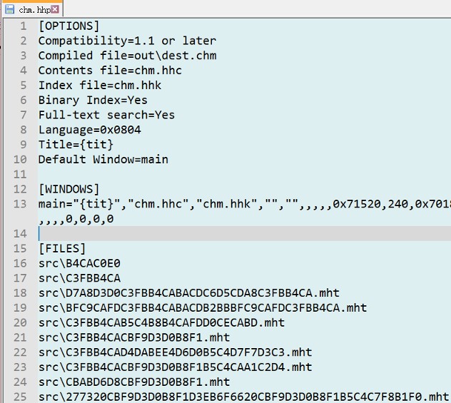 hhp后缀:这是一个搜集所有将要打包那些mht/html文件的INI配置(当然还包括描述CHM本体窗口样式的配置)